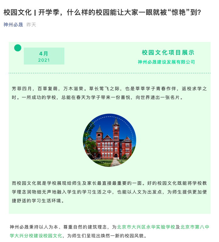 校園文化 | 什么樣的校園能讓大家一眼就被“驚 時(shí)間 :2021-04-03 10:37點(diǎn)擊 :1946 上一篇:神州必晟喜迎牛年!2020感恩相伴,2021再創(chuàng)佳績! 下一篇:神州永皓高爾夫球會(huì)月例賽,盡享自然之美與揮