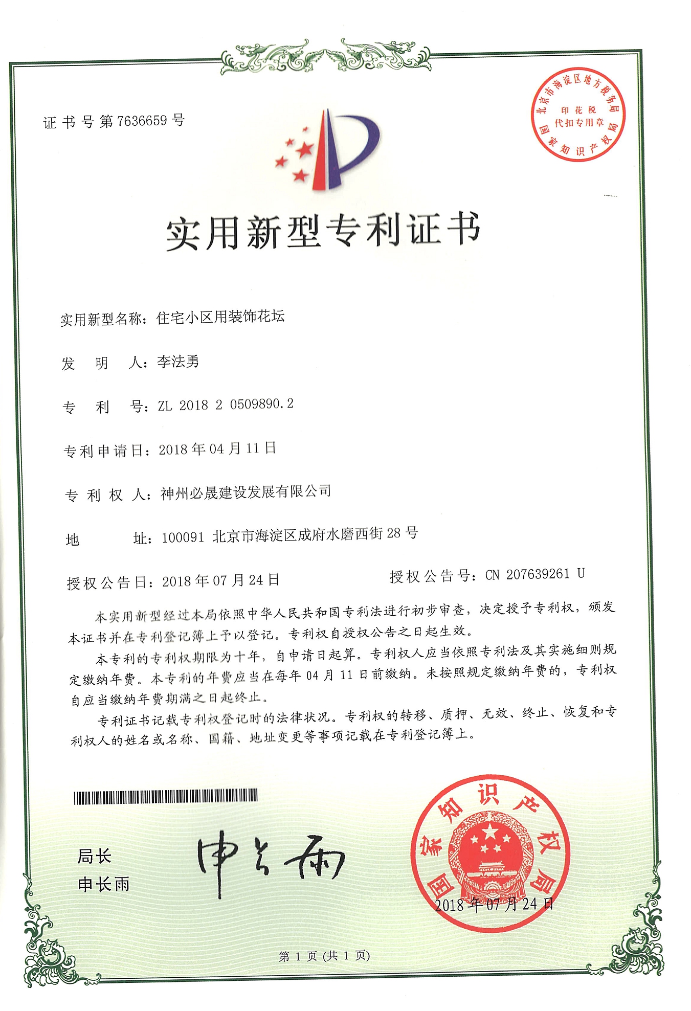 實用新型專利證書